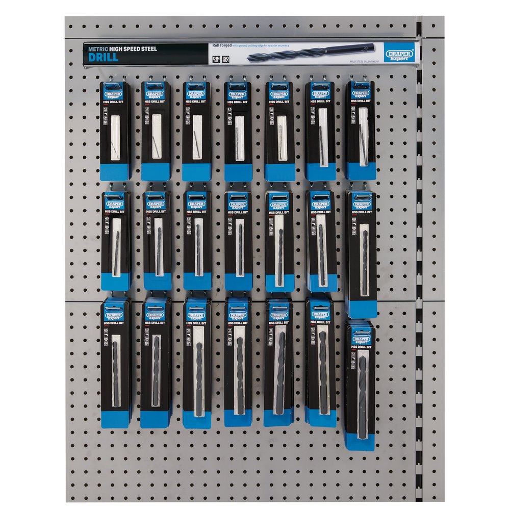 Expert quality, toolbar merchandiser for 158-piece set of assorted metric HSS drill bits for use on mild steel and aluminium. Supplied with stock and toolbar header. Pegs (Stock No. 23056) available for order to complete your display.Payment & Security