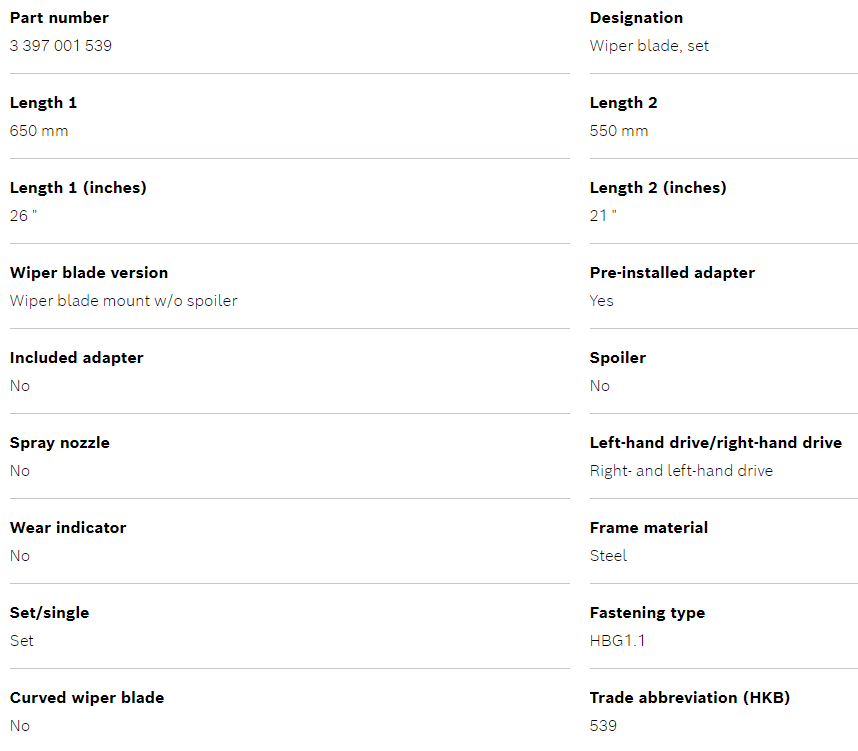 - 1 set of front wiper blades driver side (length: 650 mm) and passenger side (length: 550 mm)