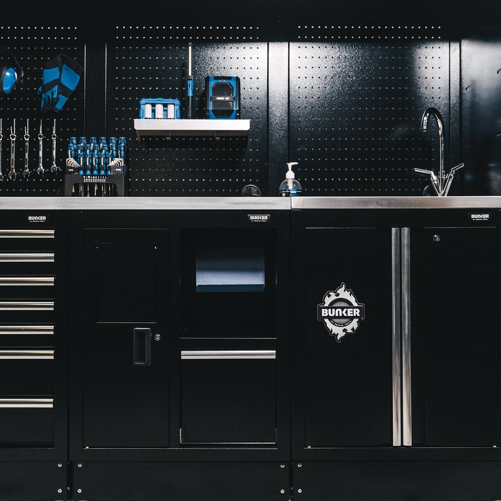 Part of the BUNKER® modular storage system. This stunningly designed premium-quality steel back panel is a great storage solution designed to keep tools on display and even more accessible when you need them. The matt black textured finish is highly durable, thanks to the industrial powder coating that protects against scratches, wear and corrosion. This pegboard can be used to connect wall cabinets to floor cabinets when used in conjunction with the side wall bracket. The panel has one pre-cut defined hole intended for passing a plug through for connection to a power supply. It measures W 602 x H 1,081 x D 24mm and can be used individually or as part of the BUNKER® modular storage system, which includes 24 clever modular options. It comes supplied with all the required fittings for simple installation. For your quality assurance, all BUNKER® units include a 10-year warranty.Payment & Security