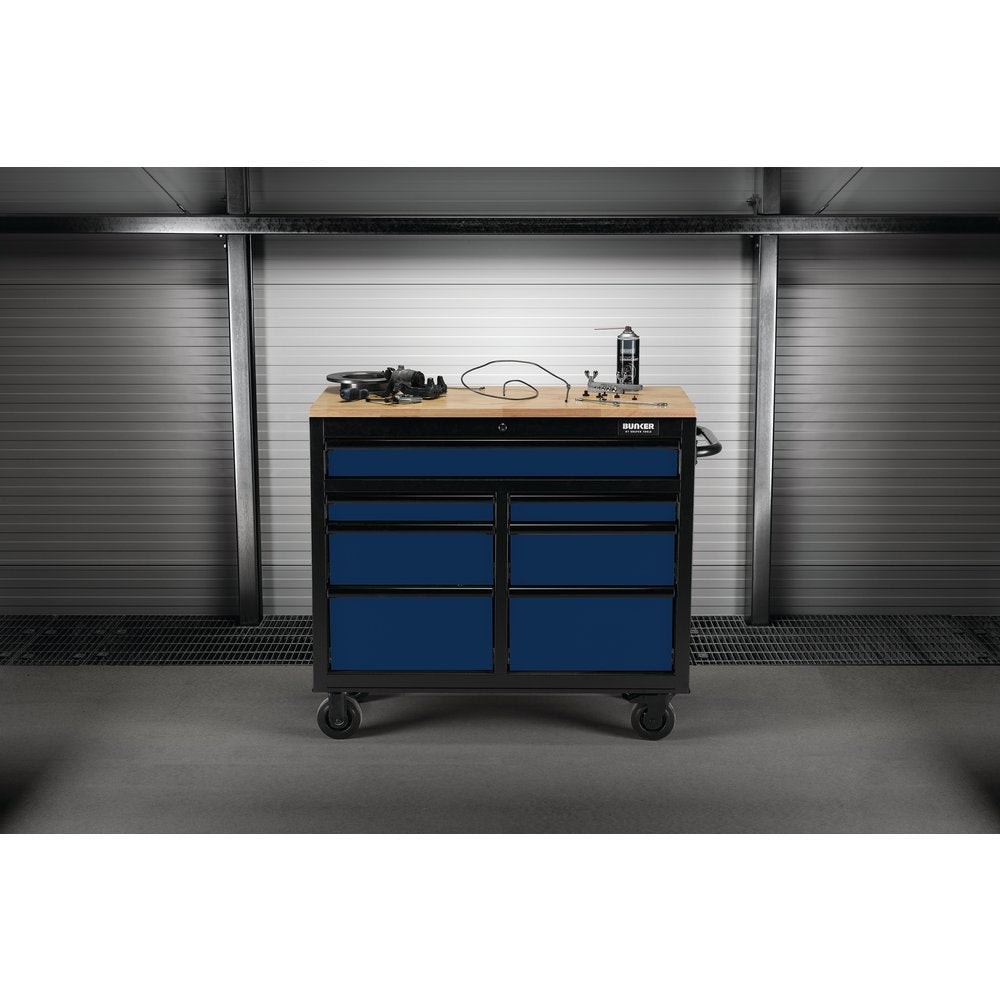 Part of the BUNKER® storage range. This stunningly designed 41" premium-quality steel unit has seven drawers embellished with a stylish black anodised aluminium trim. Each drawer has a smooth soft-close operation and is lined with lush foam to protect your tools. The cabinet’s matt blue textured finish is highly durable, thanks to the industrial powder coating that protects against scratches, wear and corrosion. This is a mobile cabinet, allowing you to keep useful items to hand wherever you need them in your garage. The 25mm-thick hardwood worktop spans the whole surface of the unit, providing a handy workspace. For ease of manoeuvrability, there is a steel handle and four durable castor wheels. Two of the wheels are fitted with brakes to keep the tool cabinet still. It has an integral lock for security and is supplied with two keys. The unit requires partial assembly and measures W 1,122 x H 951 x D 461mm. For your quality assurance, all BUNKER® units include a 10-year warranty.Fits - LANCIA PRISMA, LANCIA THEMA