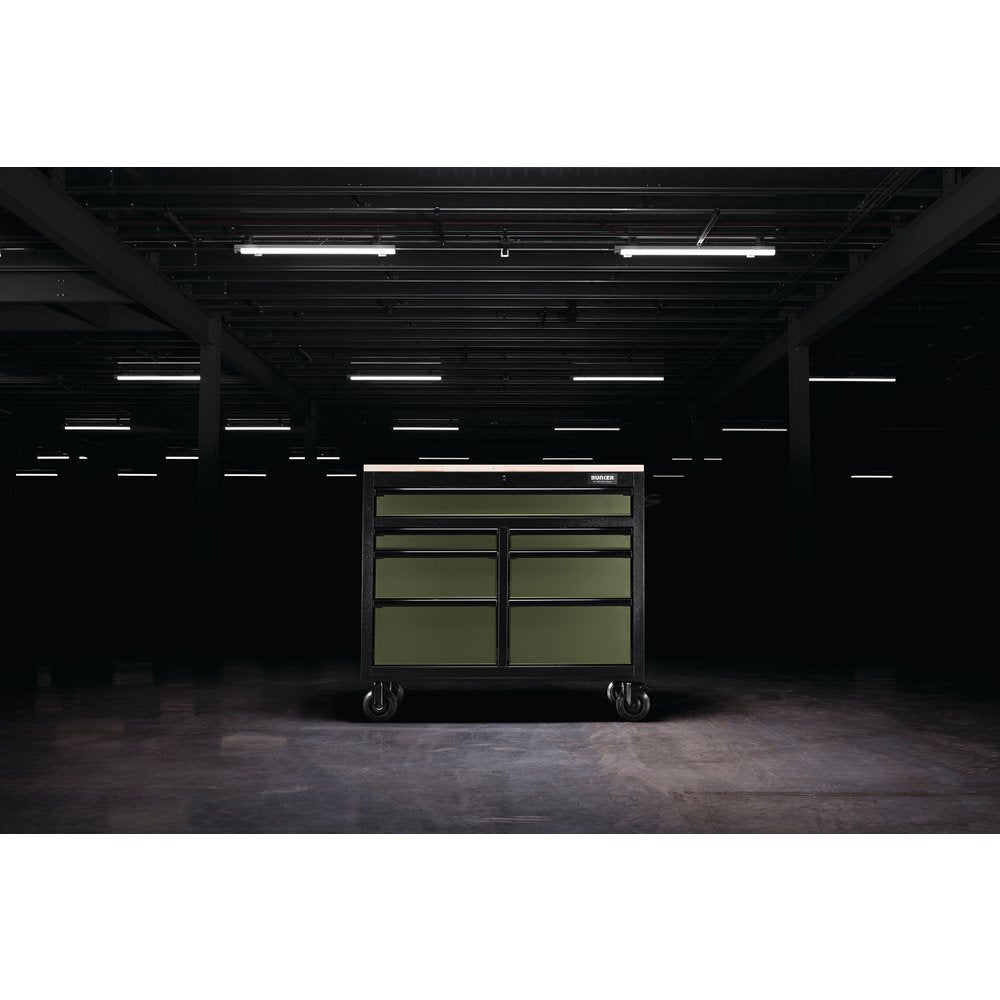 Part of the BUNKER® storage range. This stunningly designed 41" premium-quality steel unit has seven drawers embellished with a stylish black anodised aluminium trim. Each drawer has a smooth soft-close operation and is lined with lush foam to protect your tools. The cabinet’s matt green textured finish is highly durable, thanks to the industrial powder coating that protects against scratches, wear and corrosion. This is a mobile cabinet, allowing you to keep useful items to hand wherever you need them in your garage. The 25mm-thick hardwood worktop spans the whole surface of the unit, providing a handy workspace. For ease of manoeuvrability, there is a steel handle and four durable castor wheels. Two of the wheels are fitted with brakes to keep the tool cabinet still. It has an integral lock for security and is supplied with two keys. The unit requires partial assembly and measures W 1,122 x H 951 x D 461mm. For your quality assurance, all BUNKER® units include a 10-year warranty.Payment & Security