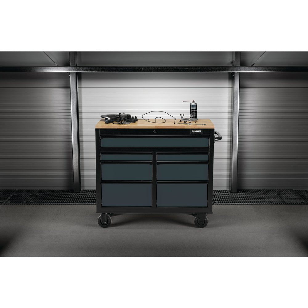 Part of the BUNKER® storage range. This stunningly designed 41" premium-quality steel unit has seven drawers embellished with a stylish black anodised aluminium trim. Each drawer has a smooth soft-close operation and is lined with lush foam to protect your tools. The cabinet’s matt grey textured finish is highly durable, thanks to the industrial powder coating that protects against scratches, wear and corrosion. This is a mobile cabinet, allowing you to keep useful items to hand wherever you need them in your garage. The 25mm-thick hardwood worktop spans the whole surface of the unit, providing a handy workspace. For ease of manoeuvrability, there is a steel handle and four durable castor wheels. Two of the wheels are fitted with brakes to keep the tool cabinet still. It has an integral lock for security and is supplied with two keys. The unit requires partial assembly and measures W 1,122 x H 951 x D 461mm. For your quality assurance, all BUNKER® units include a 10-year warranty.Payment & Security
