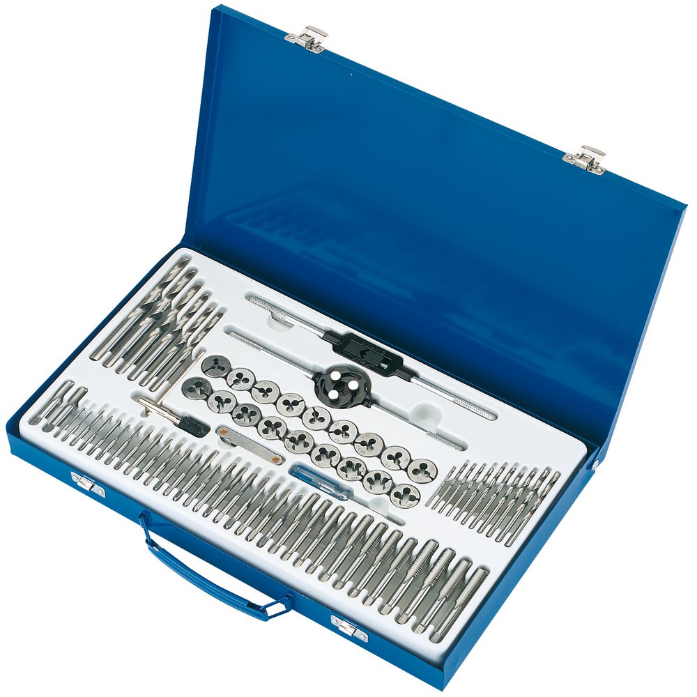Manufactured from carbon steel. Taps and dies suitable for cleaning and cutting threads on mild steel and aluminium. Supplied with the correct drill bits for tapping. Contents held in plastic insert within steel storage case.Payment & Security