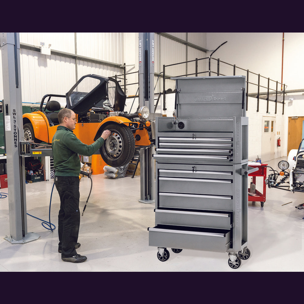 Expert Quality, ten drawer metallic silver combined roller cabinet and tool chest. Attached with braked and swivelling castors and soft grip pulling handles for easy manoeuvrability. The reinforced lid is fitted with supportive gas struts andacable access hole.Manufactured from thick sheet steel with a protective powder coated finish. Drawers are fitted with aluminium trim, 3mm EVA foam linings, secure locking system with two keys and auto retention ball bearing runners delivering smoother operation. Each tool cabinet is also Supplied with an EVA top mat on a pallet.Payment & Security