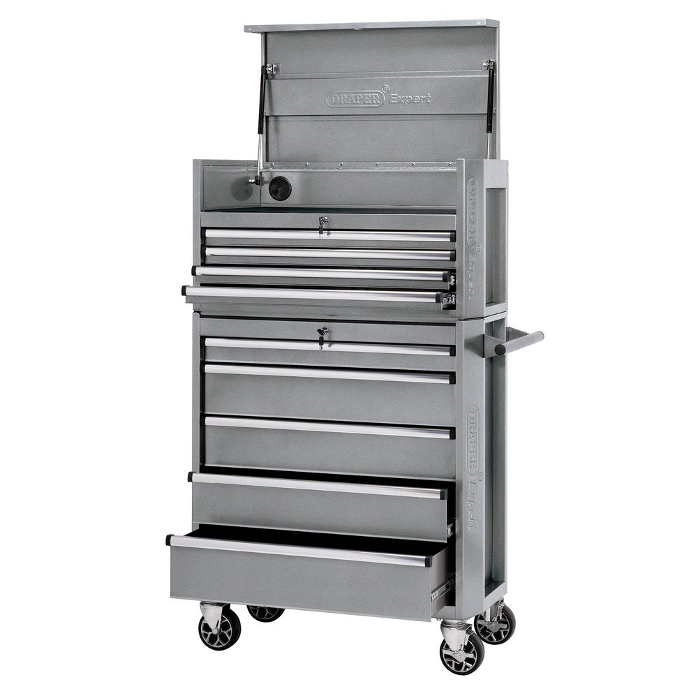 Expert Quality, nine drawers metallic silver combined roller cabinet and tool chest. Attached with braked and swivelling castors and soft grip pulling handles for easy manoeuvrability. The reinforced lid is fitted with supportive gas struts andacable access hole. Manufactured from thick sheet steel with a protective powder coated finish. Drawers are fitted with aluminium trim, 3mm EVA foam linings, secure locking system with two keys and auto retention ball bearing runners delivering smoother operation. Each tool cabinet is also Supplied with an EVA top mat on a pallet.Payment & Security