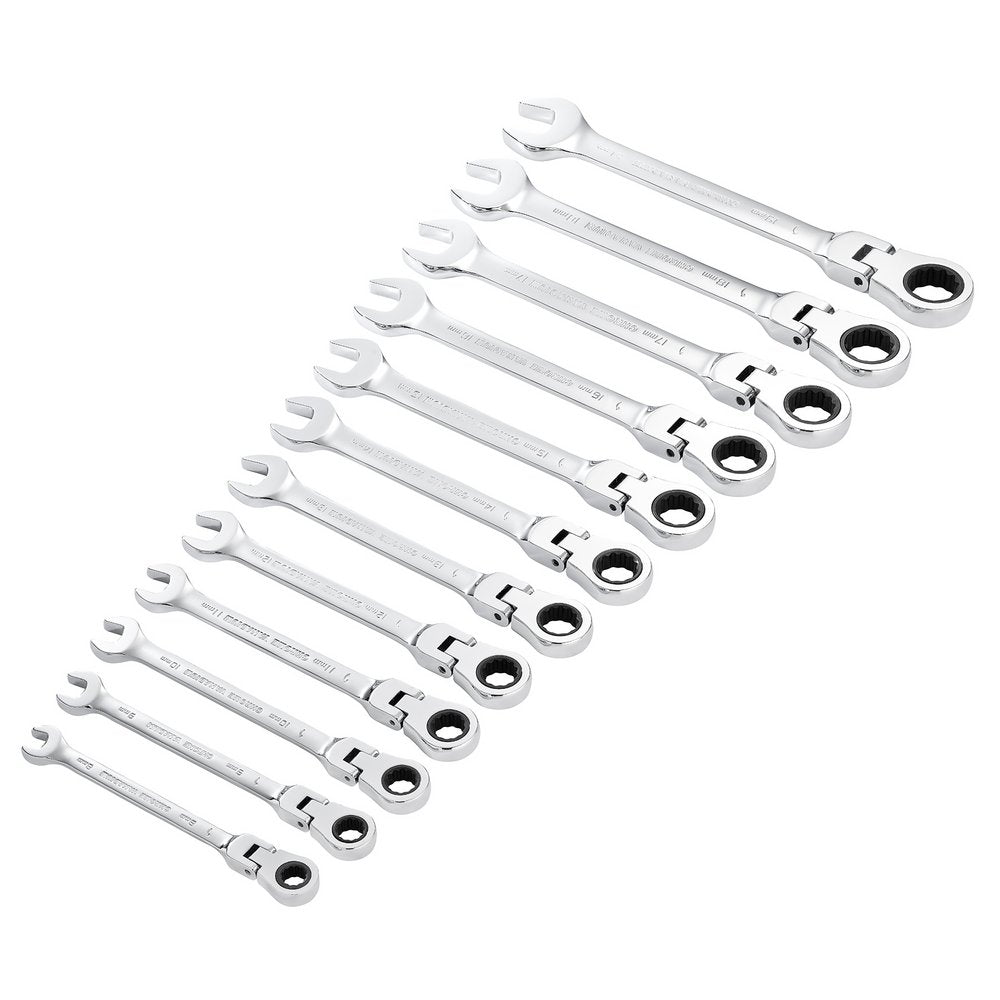 These Draper HI-TORQ® metric flexible head ratchet combination spanners are forged from chrome vanadium steel that is hardened, tempered, fully polished and mirror chrome plated for corrosion protection. The open end is offset at 15°. The 180° flex head ring end has a 90-tooth ratchet mechanism allowing 4° movement, enabling use in tight spaces. The 12-point HI-TORQ® delivers maximum leverage by transferring torque to the flats and preventing slipping or damage to the fastener. This 12-piece set contains all the popular sizes. Packed in a plastic rack.Payment & Security