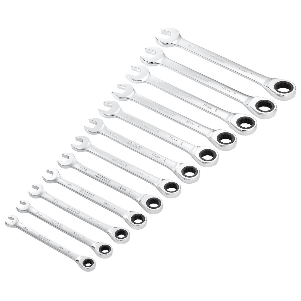 These Draper HI-TORQ® metric ratchet combination spanners are forged from chrome vanadium steel that is hardened, tempered, fully polished and mirror chrome plated for corrosion protection. The open end is offset at 15°. The ring end has a 90-tooth ratchet mechanism allowing 4° movement, enabling use in tight spaces. The 12-point HI-TORQ® delivers maximum leverage by transferring torque to the flats and preventing slipping or damage to the fastener. This 12-piece set contains popular sizes. Packed in a plastic rack.Payment & Security