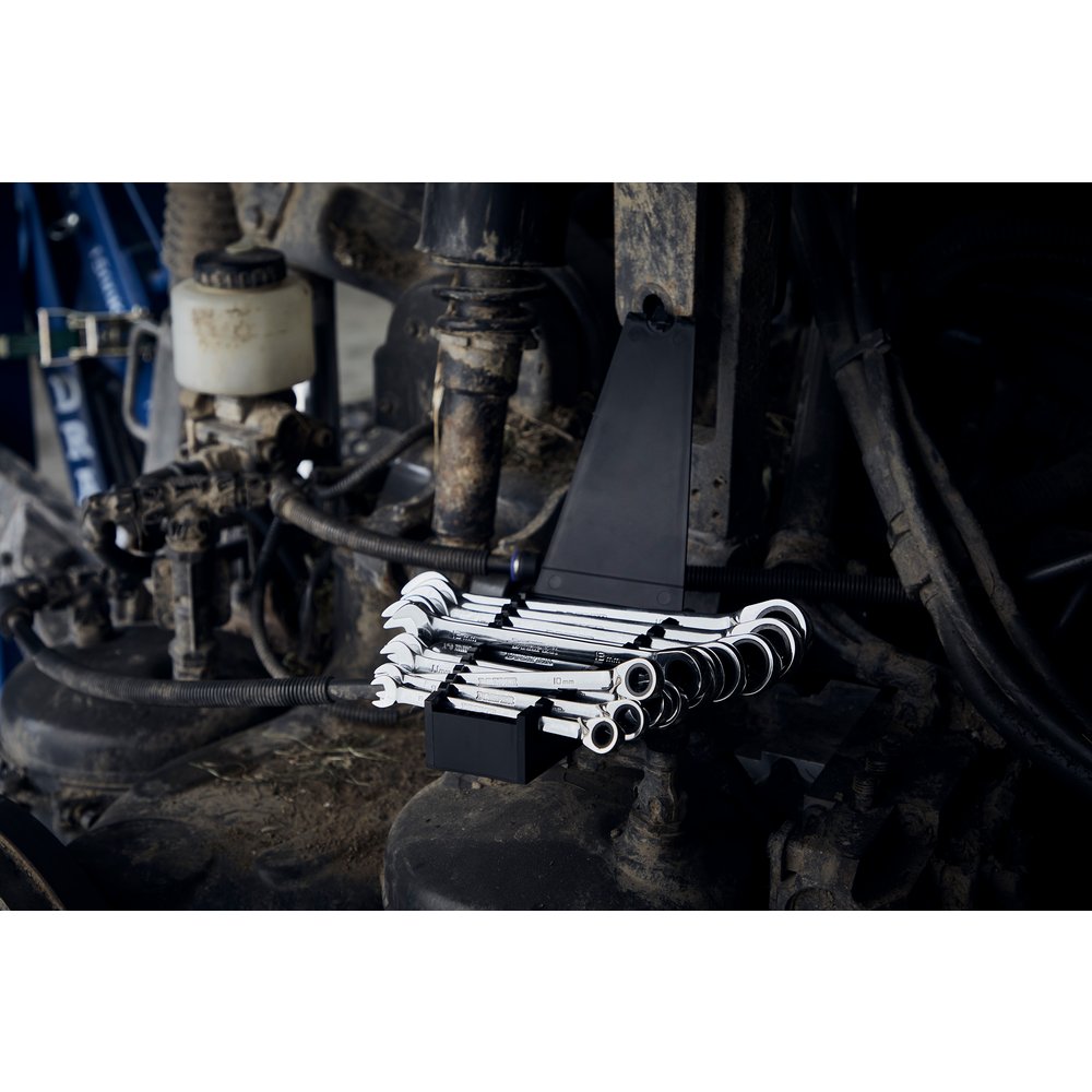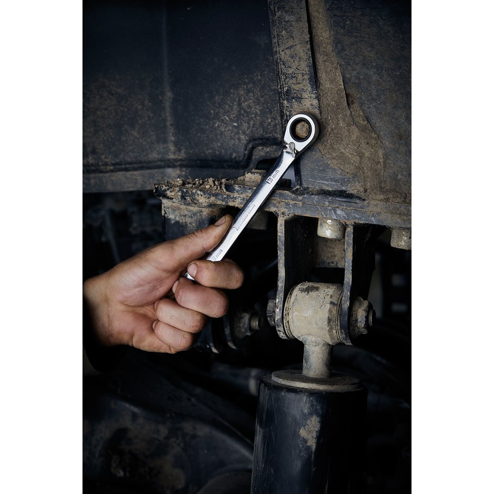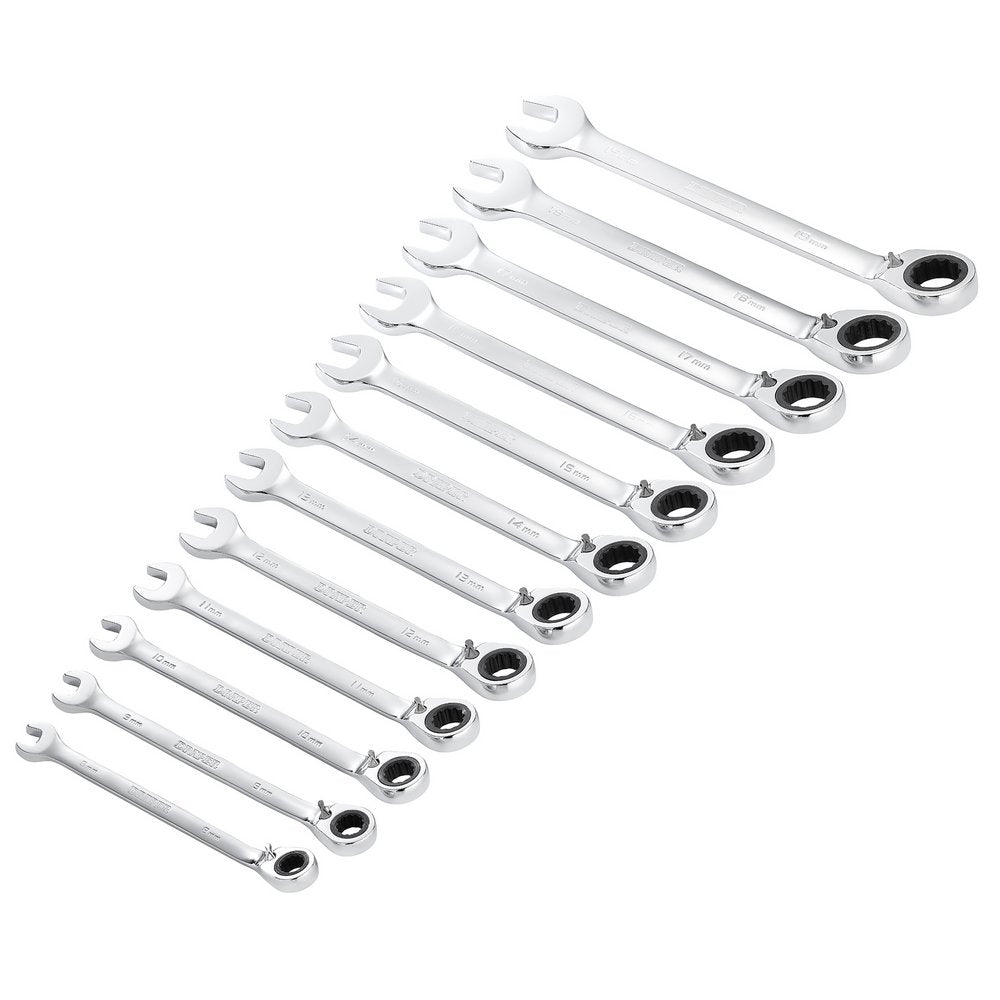 These Draper HI-TORQ® metric reversible ratchet combination spanners are forged from chrome vanadium steel that is hardened, tempered, fully polished and mirror chrome plated for corrosion protection. The open end is offset at 15°. The ring end has a 15° cranked head which incorporates a 90-tooth ratchet mechanism allowing 4° movement, enabling use in tight spaces. There is also a forward and reverse direction lever on the ring end. The 12-point HI-TORQ® delivers maximum leverage by transferring torque to the flats and preventing slipping or damage to the fastener. This 12-piece set contains the full range.Payment & Security