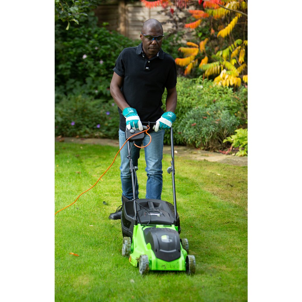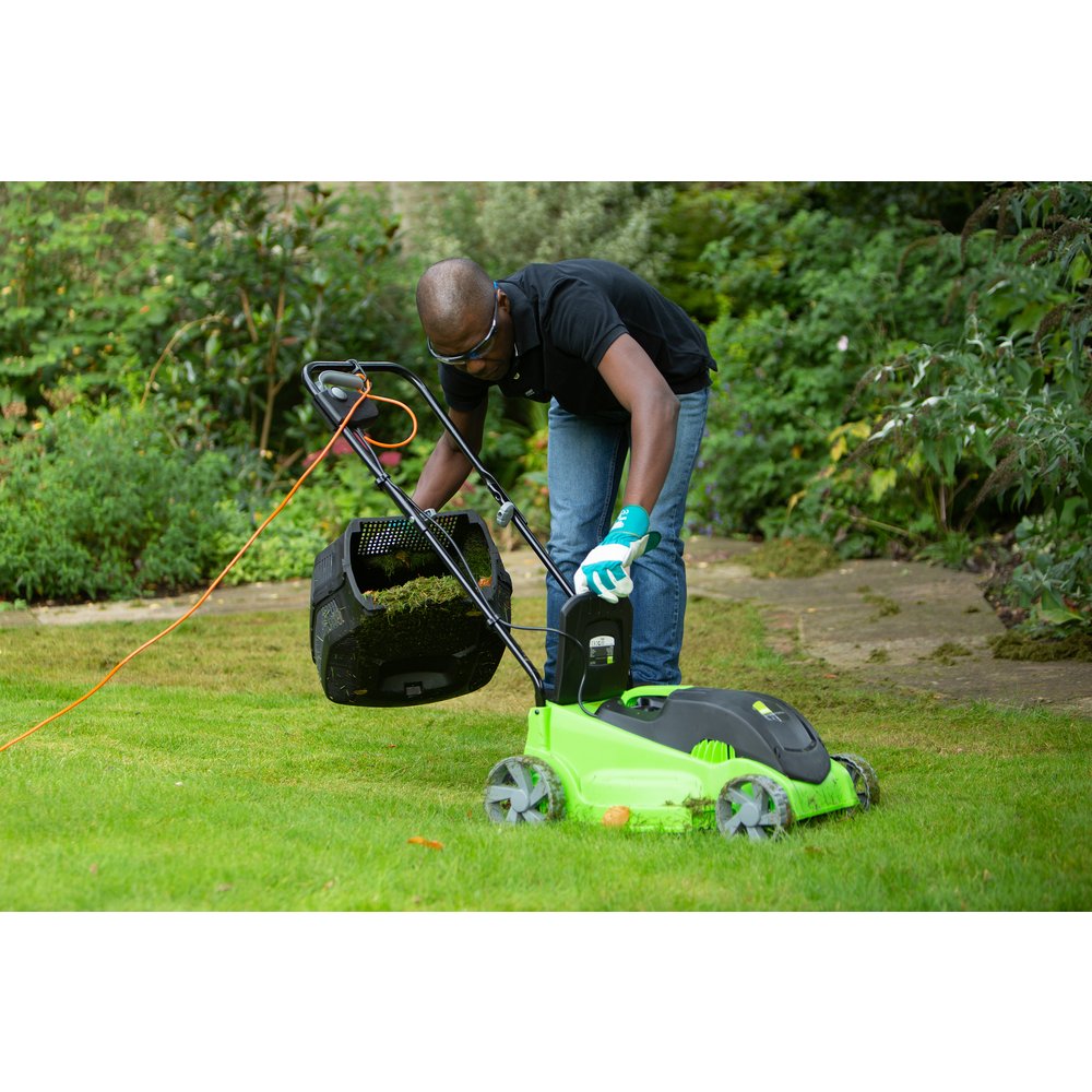 This electric lawn mower has a powerful 1400W motor, a 380mm cutting width and a 10m long-reach power cable - making it ideal for medium-sized lawns. To provide a choice of finish, there are three adjustable cutting heights - 28, 48 and 68mm. The height is easily adjusted by moving a single lever to one of the three cut positions. The large, durable 45L grass collection box ensures more time is spent mowing than emptying grass cuttings. It weighs 9kg, so it's lightweight and easy to manoeuvre. There is a carry handle on the motor and the main handle folds down to make the mower easier to store while not in use.Payment & Security