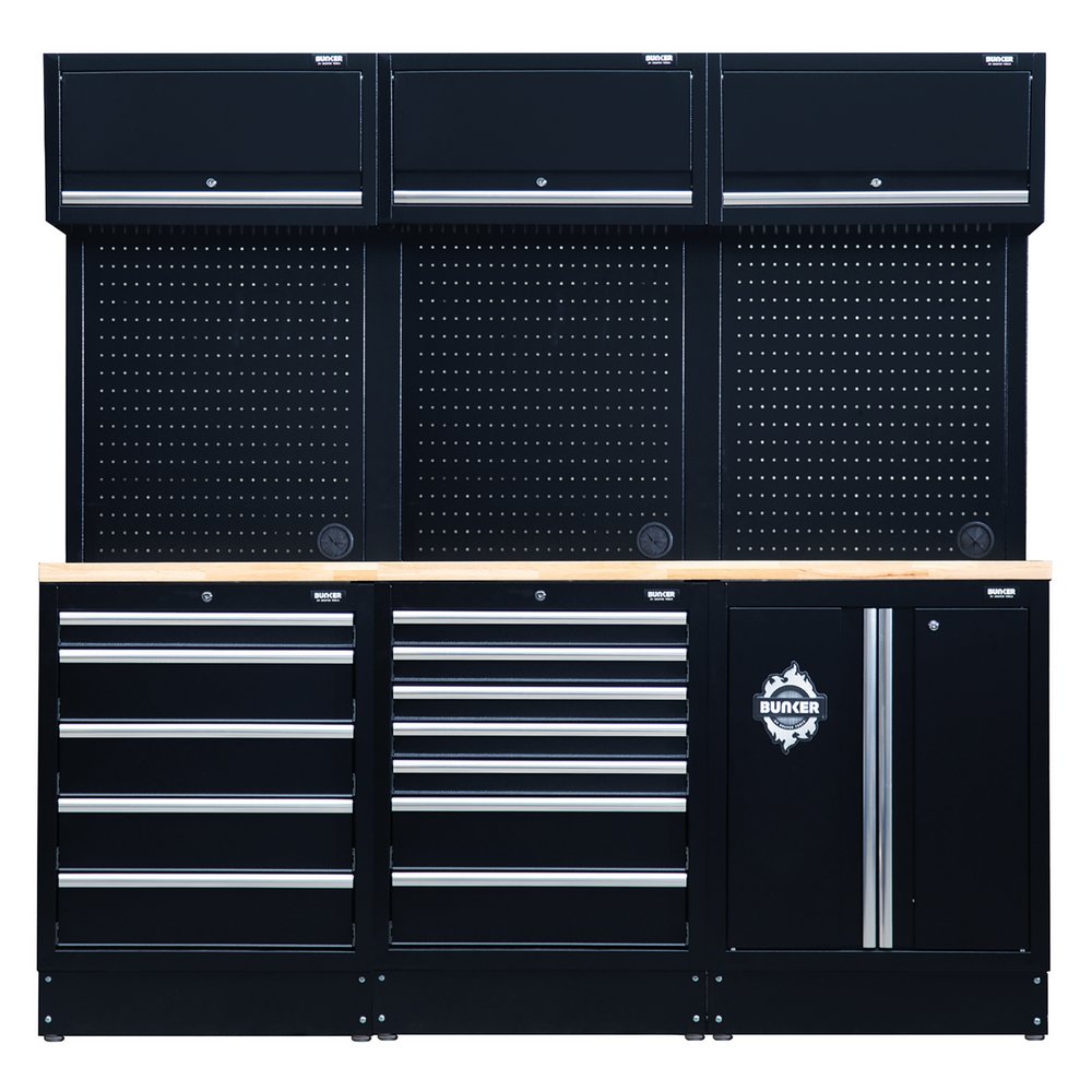 Part of the BUNKER® modular storage system. This stunningly designed combo is easily installed inside a garage or workshop to create your ideal storage system. All units are made from premium-quality steel and have a durable matt black textured industrial powder-coated finish. The floor cabinets are covered by a stylish hardwood worktop and provide incredibly versatile storage, featuring large cupboards with fully adjustable shelves and smooth soft-close drawers lined with lush foam to protect your tools. The fixed base cabinets have adjustable feet for optimal positioning on an uneven floor. All wall cabinets have lift-up doors for convenient access, operated by whisper-quiet gas struts. For added storage, the back panels act as pegboards, and each includes one pre-cut hole for access to a power supply. Each unit has an integral lock for security and two keys are supplied. The combo comes with all the required fittings for simple installation. For your quality assurance, all BUNKER® units include a 10-year warranty. Every combo includes a free magnet of the distinctive BUNKER® logo.Payment & Security