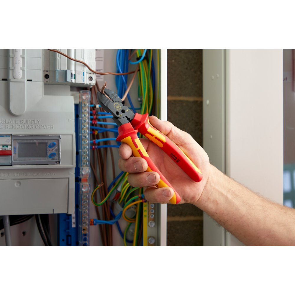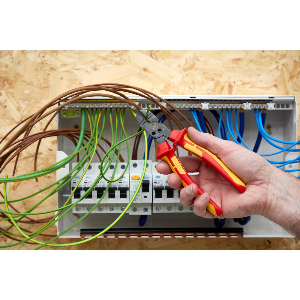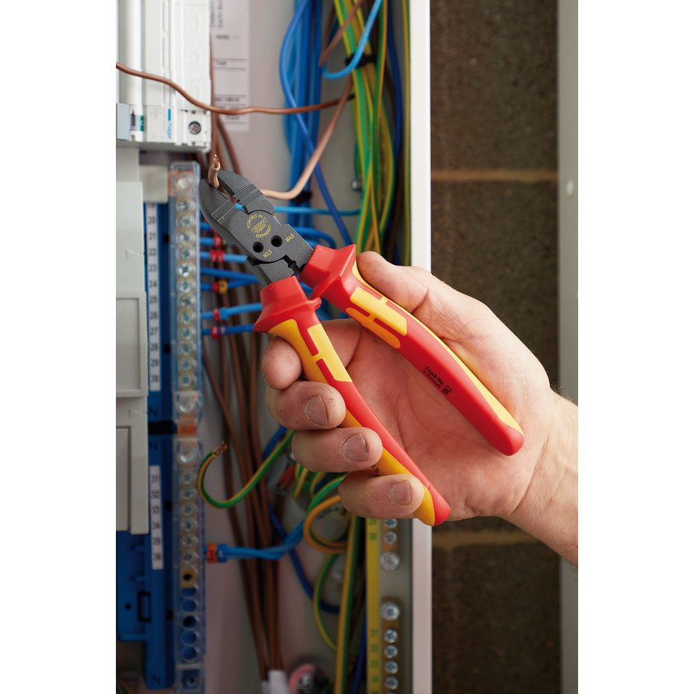 Expert quality XP1000®, manufactured from premium steel forged in Germany. This convenient combination cutter is an all-in-1 side cutter - 3.5mm pattress screw and 4mm conduit cover screw shear, wire bending anvil and 1.5 and 2.5mm wire stripper. The two-part bi-material ergonomic soft grip handle allows maximum grip and user comfort. Handle equipped with tethering hole for attachment to a lanyard while working at height. Tested to 10,000V, these pliers are suitable for working on live circuits of 1,000V AC and 1,500V DC.Payment & Security