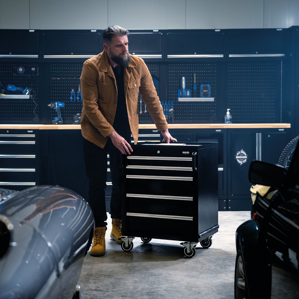 Part of the BUNKER® modular storage system. This stunningly designed combo is easily installed inside a garage or workshop to create your ideal storage system. All units are made from premium-quality steel and have a durable matt black textured industrial powder-coated finish. The floor cabinets provide incredibly versatile storage, featuring large cupboard spaces with fully adjustable shelves and smooth soft-close drawers lined with lush foam to protect your tools. They also offer a functional workspace with hardwood worktops and an integrated rubbish bin and paper towel roll holder, plus a mobile cabinet with five drawers. The fixed base cabinets have adjustable feet for optimal positioning on an uneven floor. All wall cabinets have lift-up doors for convenient access, operated by whisper-quiet gas struts. For added storage, the back panels act as pegboards, and each includes one pre-cut hole for access to a power supply. Each unit has an integral lock for security and two keys are supplied. The combo comes with all the required fittings for simple installation. For your quality assurance, all BUNKER® units include a 10-year warranty. Every combo includes a free magnet of the distinctive BUNKER® logo.Payment & Security