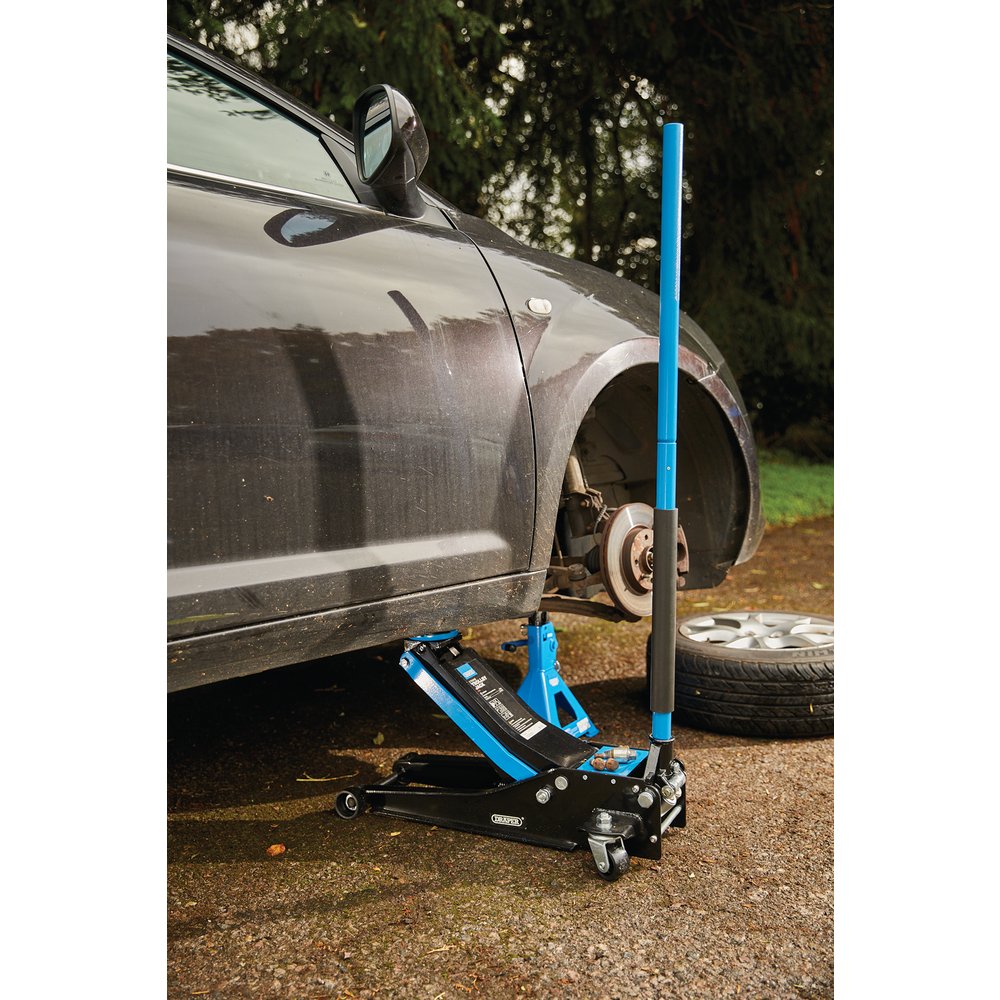 This low profile trolley jack is capable of lifting from 75-505mm and it has a capacity of 3 Tonne. It has a twin-piston quick lift facility, with eight pumps to enable it to reach maximum height efficiently. The twin spring return system ensures the jack lowers safely when not under load. It is fitted with a twin safety valve to prevent the jack from overloading. There is an integrated rubber saddle pad to prevent damage to the underside of the vehicle when in operation. There is also an EVA foam handle cover to prevent panel damage. The knurled handgrip on the end of the lifting arm enables a more secure hold when used. Fitted with hardwearing nylon wheels with rear swiveling castors, for quiet and smooth operation. These wheels also prevent damage to garage floors.Payment & Security