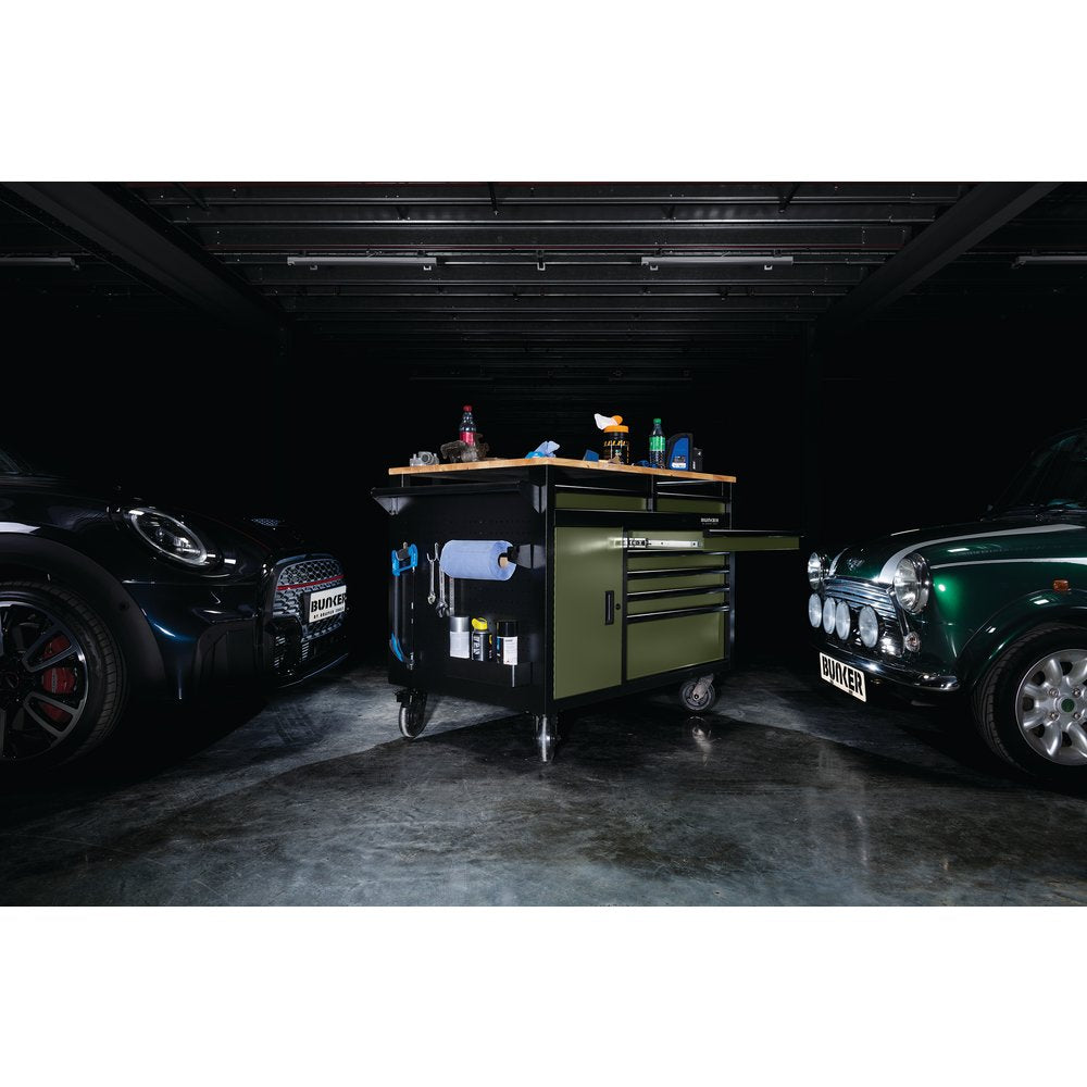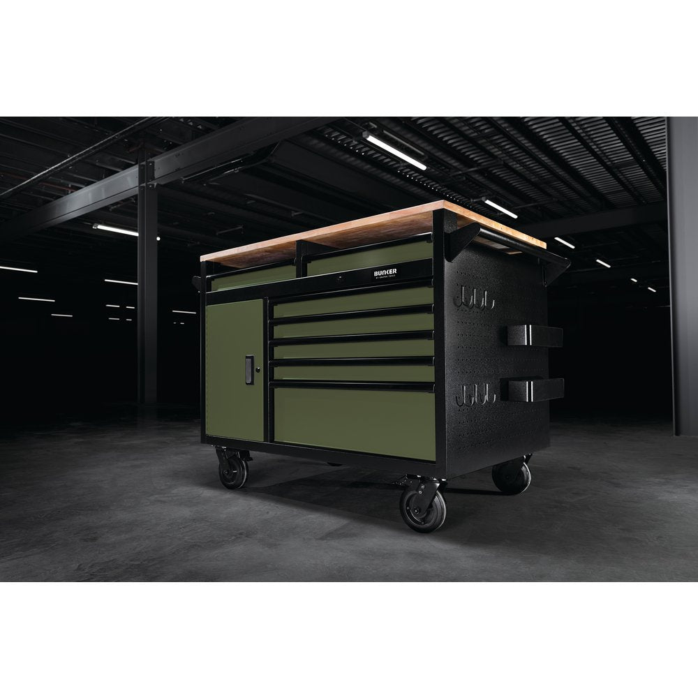 Part of the BUNKER® storage range. This robust 48" multifunctional mobile cabinet offers excellent tool storage and workspace capabilities. It has access from both sides and includes 14 drawers, a worktop and a double-sided storage cupboard with a shelf. There are also pegboards on the two side panels for hanging tools and equipment, with a paper towel holder and ample space for storing cans. Made from premium-quality steel, the unit has a matt green textured finish which is highly durable, thanks to the industrial powder coating that protects against scratches, wear and corrosion. This stylish look is further enhanced with a black anodised aluminium trim. Each drawer has a smooth soft-close operation and is lined with lush foam to protect your tools. The 25mm-thick hardwood worktop spans the whole surface of the unit, providing a handy workspace. For ease of manoeuvrability, there is a steel handle and four durable castor wheels. Two of the wheels are fitted with brakes to keep the tool cabinet still. It has an integral lock for security and is supplied with two keys. The unit requires partial assembly and measures W 1,430 x H 1,009 x D 800mm. For your quality assurance, all BUNKER® units include a 10-year warranty.Payment & Security