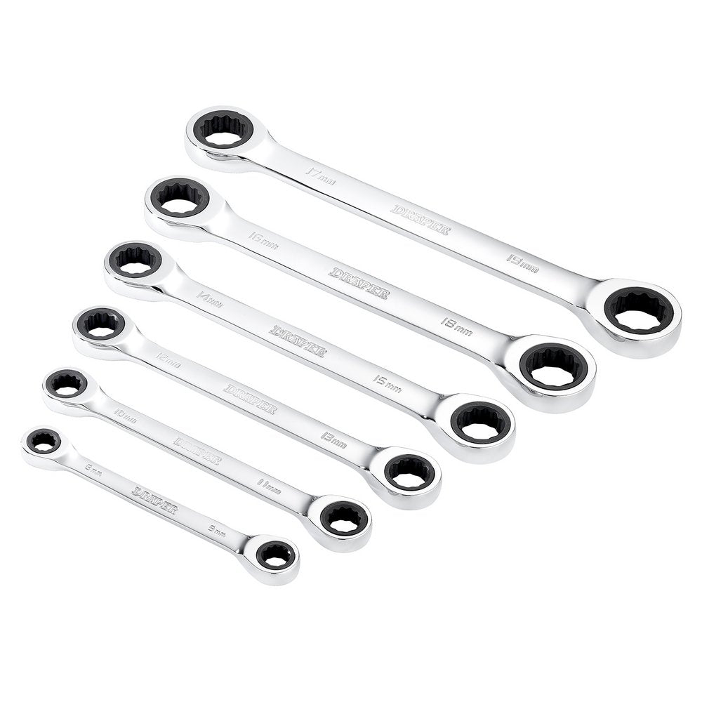 These Draper HI-TORQ® metric double ring ratchet spanners are forged from chrome vanadium steel that is hardened, tempered, fully polished and mirror chrome plated for corrosion protection. Both ring ends have a 90-tooth ratchet mechanism, and the 4° movement enables use in tight spaces. The 12-point HI-TORQ® delivers maximum leverage by transferring torque to the flats and preventing slipping or damage to the fastener. This six-piece set contains the full range.Payment & Security