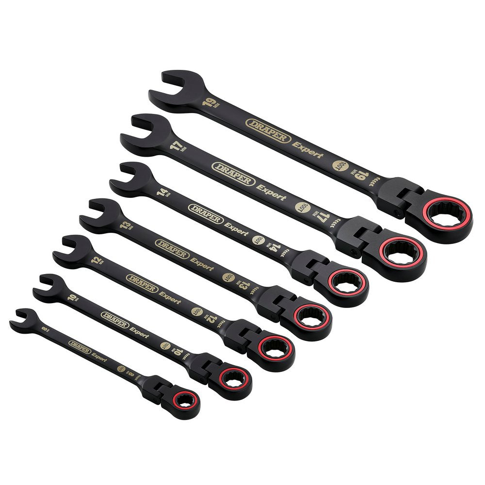 The Draper Expert HI-TORQ® metric flexible head ratchet combination spanners in this seven-piece set are manufactured from hardened and tempered chrome vanadium steel, with black electroplating for corrosion protection. The 100-tooth ratchet mechanism enables 3.6° movement and with a 180° flexible head and the open end set at 15°, these spanners are ideal for use where there’s limited space. The ring end is 12-point Draper Expert HI-TORQ®, providing a superior grip; with Draper Draper Expert HI-TORQ®, the spanners grip the flats of the fastener rather than the corners. This gives more grip while transmitting more torque to the nut or bolt and prevents damage to the corners by spreading the load across the flats. The set comes supplied in a useful storage/carry rack.Payment & Security