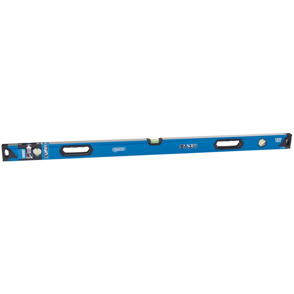 High quality, aluminium box section levels with three permanently fixed, shock resistant, acrylic UV resistant vials, one horizontal vial, one vertical and one 45° vials, one with side view vial feature. Precision milled top and bottom. Levels are electrostatically epoxy powder coated and baked for maximum protection. Fitted with shock absorbing end caps. Accuracy of 0.5mm per 1M = 0.029° in standard position.