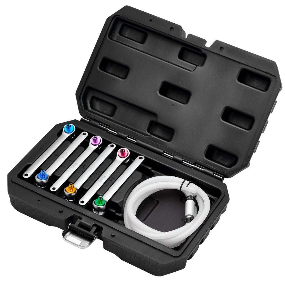 This brake bleeder wrench kit allows the completion of a brake bleeding service without removing the wheels or raising the vehicle. Wrenches made from high-quality steel for durability and strength. Satin finish for corrosion protection. Colour-coded for easy identification. Drain hose fitted with a one-way valve. Supplied inside blow moulded plastic storage case.