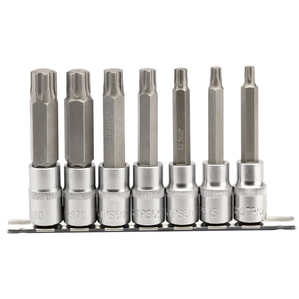 Expert Quality, 7 Draper TX - STAR® Plus socket bits, 100mm long. All socket manufactured from hardened and tempered chrome vanadium steel with sand blasted bits of S2 silicon steel. Each socket has a knurled ring for extra grip. Supplied on a steel socket retaining rail.Payment & Security