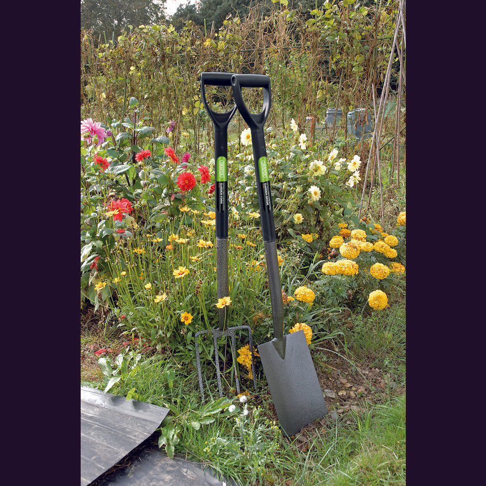 Epoxy coated carbon steel, fully hardened and tempered with plastic coated steel cored shaft and plastic "Y - dee" handle. The overall length of 1050mm is especially useful for people 6ft tall and over, allowing a straighter back when digging, giving less strain and more leverage.