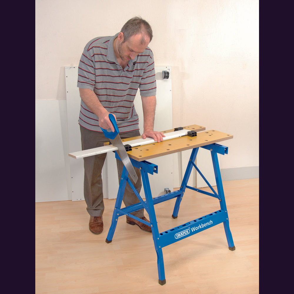 Portable workbench with dual clamping action and 24 holes for work clamping dogs. Folds flat for secure storage. Two - piece MDF worktop. Sturdy legs manufactured from strong box section steel. Maximum clamping width with dogs 260mm. Supplied with four plastic clamping dogs and fixings. Weight 7.5kg.(approx.). Flat packed with assembly instructions.Payment & Security