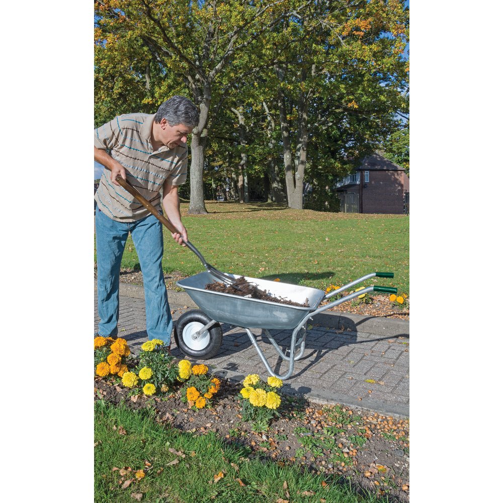 Galvanised wheelbarrow, perfect for general use. The 65 - litre, 0.7mm galvanised steel tray is fitted to a rigid tubular frame and attached with a pneumatic tyre for a smoother ride. Supplied flat packed with easy to read assembly instruction manual.Payment & Security
