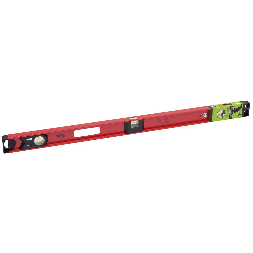 High quality, hardened aluminium girder section levels with three permanently fixed solid acrylic cylindrical shock resistant UV resistant vials, one horizontal, one vertical with side view feature and one 45° vial. Levels electrostatically, epoxy powder coated and baked for maximum protection. Metric/imperial rule on top edge. Fitted with shock absorbing end caps. V - Groove for levelling pipework. Accuracy 1.75mm per 1M = 0.1° in standard position.