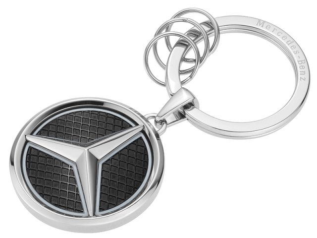 The practical key fob made of robust stainless steel presents itself as a replica of the original illuminated Mercedes central star. The black PVD-coated spaces in between have a diamond look, while the lines inside the Mercedes star are made of luminous material which, if charged beforehand with daylight or an artificial light source, glows bluish in the dark for up to four hours. The approx. 9 cm long key fob has a flat split ring with a Mercedes-Benz laser engraving and is equipped with three additional mini split rings for quickly changing and removing individual keys.- Colour: silver/black