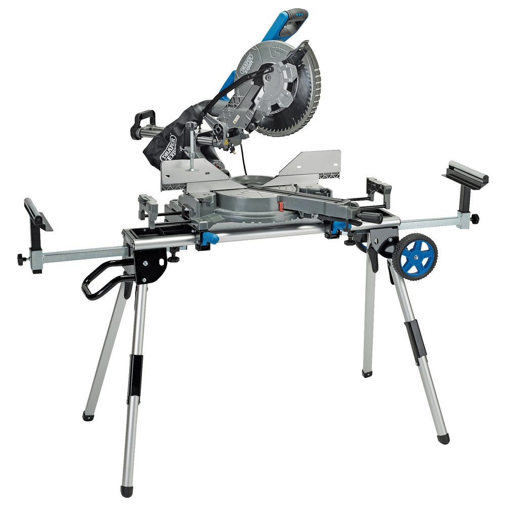Extending mitre saw stand with height-adjustable work-support rollers enabling use with timbers over 2M in length. Made from lightweight steel and aluminium that's fitted with an extendable galvanized beam, fully adjustable end rollers and quick - action locking levers for securely bracing the mitre saw in place. The round aluminium folding legs and sturdy wheels deliver ease of storage and transportation even with a mitre saw locked in situ. Equipped with a handy tool tray and a mesh bottom to store and 'catch' small tools. Compatible with most makes of mitre saws.Payment & Security
