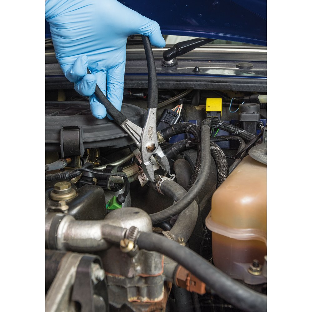 Spring loaded pliers for gripping hose clamps. Perfect when removing or replacing radiator pipes on cars and commercial vehicles. The notched jaws clasp on two sides. Designed for standard hose clamps and VAG Group fuel line/ventilation pipe clamps. Manufactured from hardened steel with soft grip handles.Payment & Security