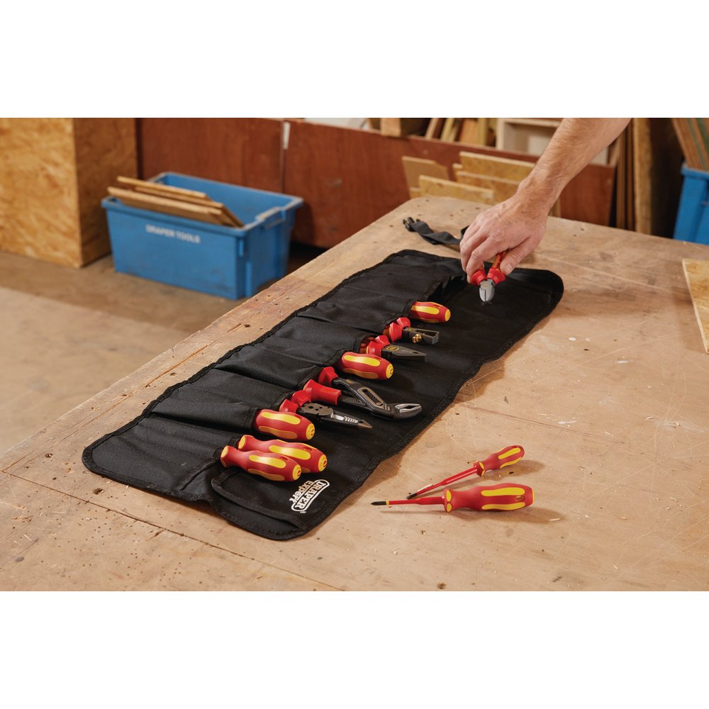 This high-quality multi-pocket tool roll is suitable for storing 14 tools, such as pliers and screwdrivers. There are two pocket sizes - 10 large and four medium. It is made from heavy-duty polyester and has an internal flap to protect the tools when folded. There is an additional wraparound webbed strap and a plastic clip to secure the roll when closed. It is an ideal portable storage solution for an electrician or mobile engineer. Overall size is 840 x 310mm.Payment & Security