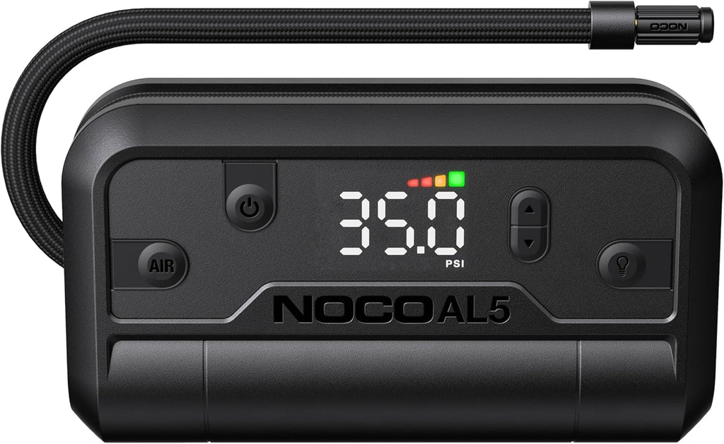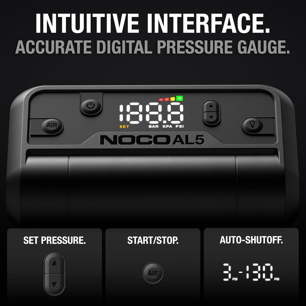 Introducing NOCO AL5 a 12-volt, 5-amp portable air compressor with a 138-watt motor rated at a maximum pressure of 130 PSI. AL5 is the next generation of portable air compressors, utilizing advanced motor and airflow design in an unbelievably compact form with uncompromising performance, it runs longer, fills faster, and is infinitely better.