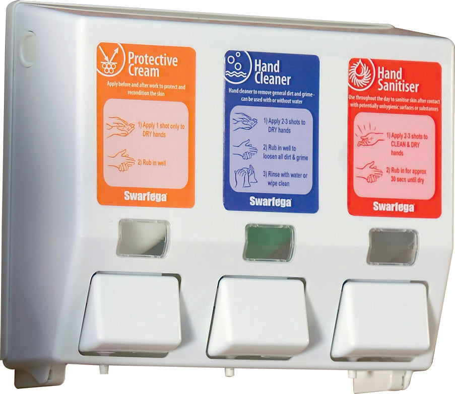 Skin safety centre for 3 x 750 ml pump cartridges. Complete 3 step skin care system to protect, clean and sanitise skin. Especially designed for areas with limited space and where no running water is available