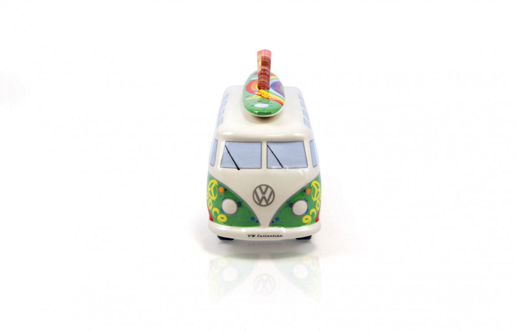 Colourful ceramic moneybanks in the shape of different VW Bus models.