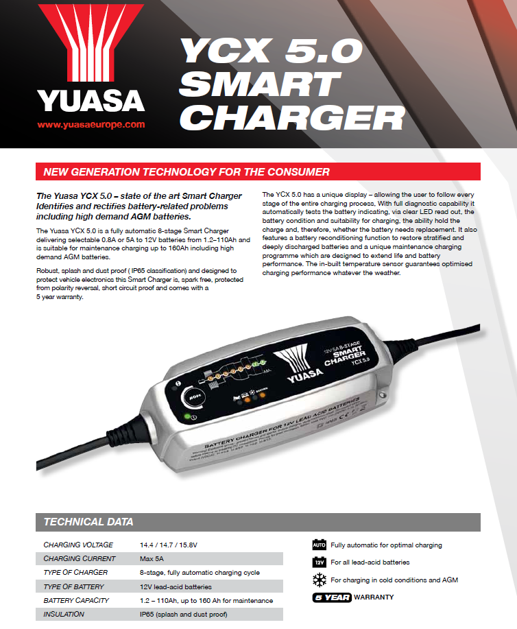 The Yuasa YX 5.0 – state of the art Smart ChargerIdentifies and rectifies battery-related problemsincluding high demand AGM batteries.The Yuasa YCX 5.0 is a fully automatic 8-stage Smart Chargerdelivering selectable 0.8A or 5A to 12V batteries from 1.2–110Ah andis suitable for maintenance charging up to 160Ah including highdemand AGM batteries.Robust, splash and dust proof ( IP65 classification) and designed toprotect vehicle electronics this Smart Charger is, spark free, protectedfrom polarity reversal, short circuit proof and comes with a5 year warranty.The YCX 5.0 has a unique display – allowing the user to follow everystage of the entire charging process, With full diagnostic capability itautomatically tests the battery indicating, via clear LED read out, thebattery condition and suitability for charging, the ability hold thecharge and, therefore, whether the battery needs replacement. It alsofeatures a battery reconditioning function to restore stratified anddeeply discharged batteries and a unique maintenance chargingprogramme which are designed to extend life and batteryperformance. The in-built temperature sensor guarantees optimisedcharging performance whatever the weather.