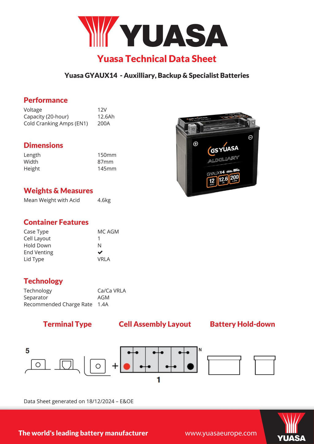GYAUX14 12V 12.6Ah 200A GS Yuasa Auxiliary Battery