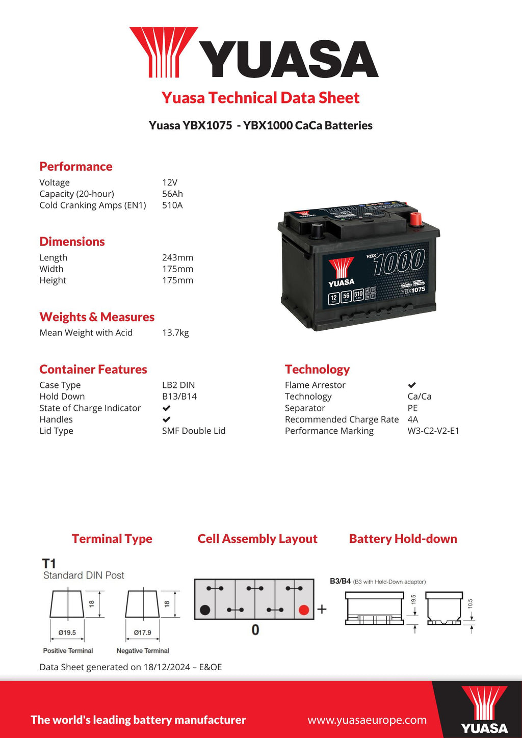 YBX1075 12V 56Ah 510A Yuasa Battery. European DIN Type