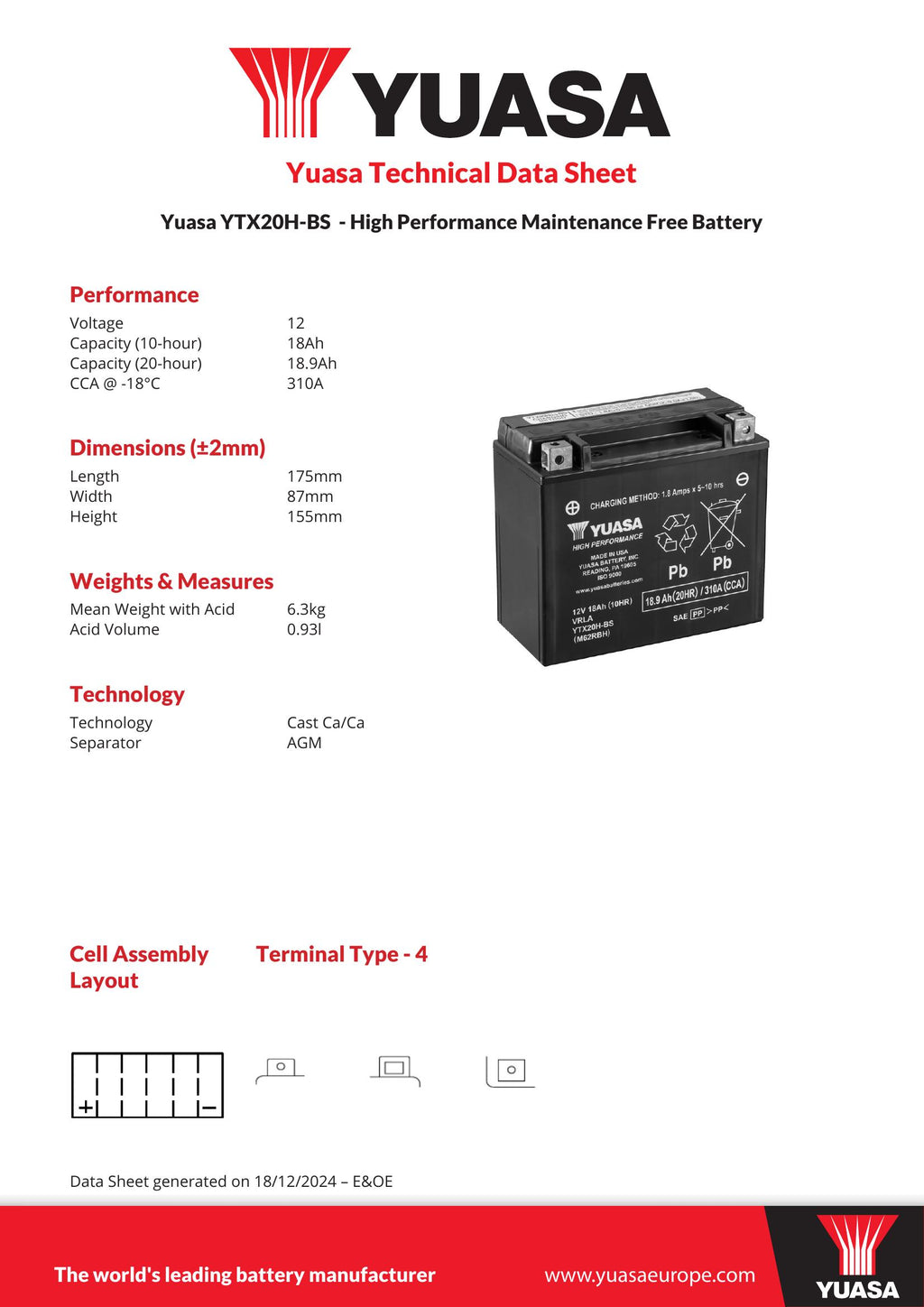 Yuasa YTX20H-BS 12V High Performance Maintenance Free Battery