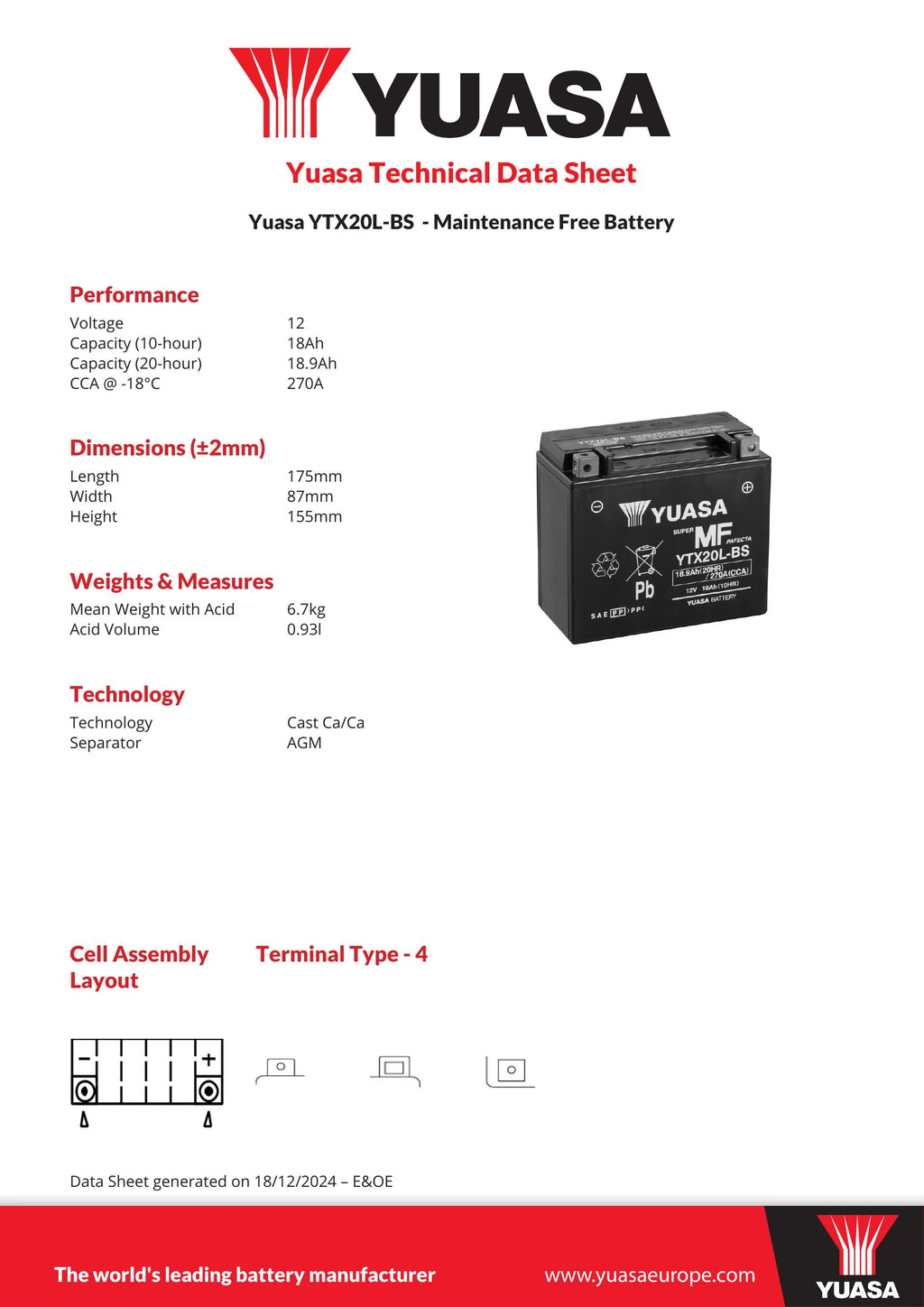 Yuasa YTX20L-BS 12V Maintenance Free Battery