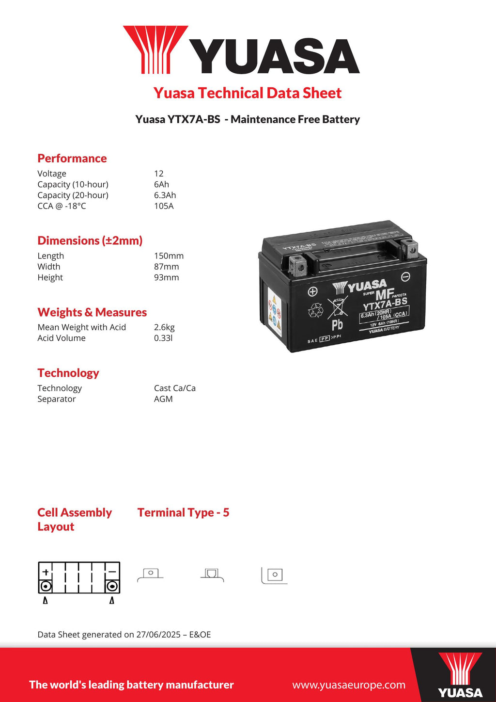 Yuasa YTX7A-BS / YTX7A 12V Maintenance Free Battery